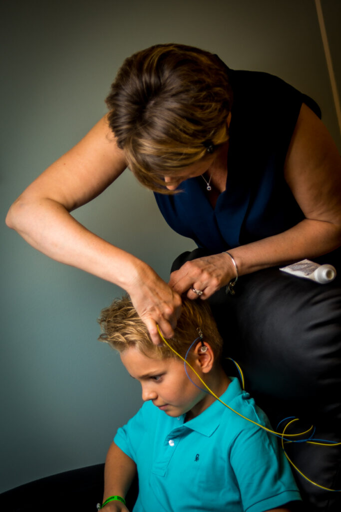 Le Neurofeedback Dynamique® est une technologie issue des neurosciences qui analyse l’activité électrique du cerveau 256 fois par seconde grâce à de petits capteurs placés sur le cuir chevelu et les oreilles.